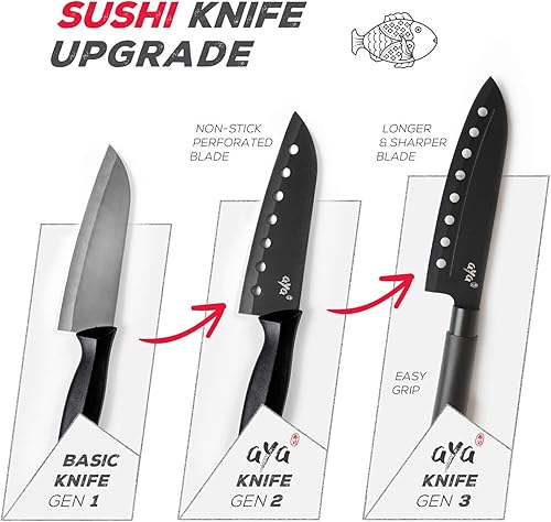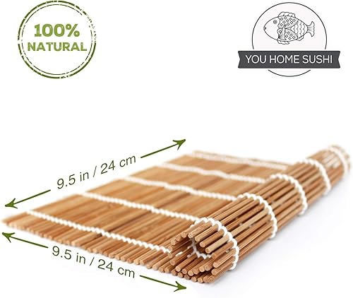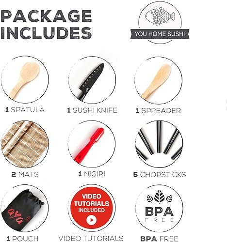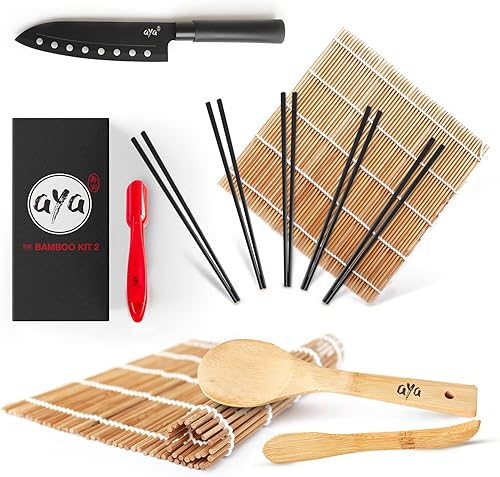 Aya Kit à Sushi -2 Nattes de Première Qualité - Kit Bambou 100% Naturel avec Couteau à Sushi - Tutoriels Vidéo - Spatule et Cuillère à Riz