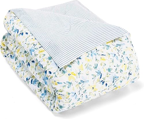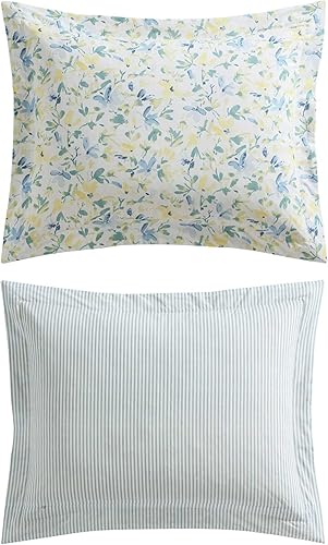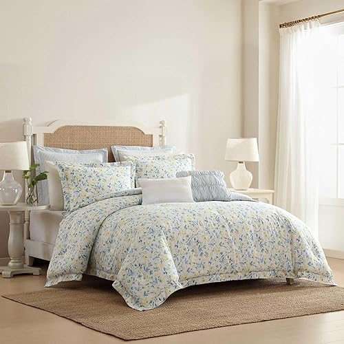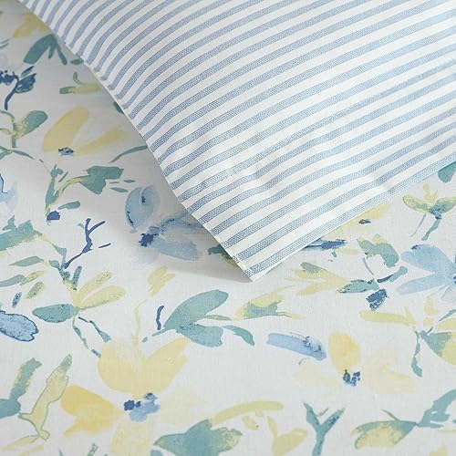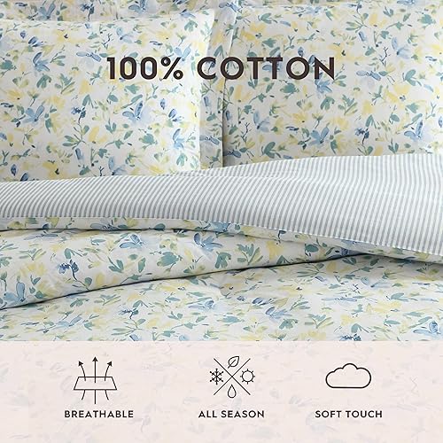 Laura Ashley Parure de lit réversible Douce, Comprend des taies d'oreiller et des oreillers Assortis en Coton, Bleu Nora/Jaune/Vert/Blanc, lit Double