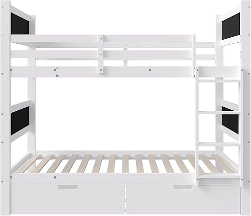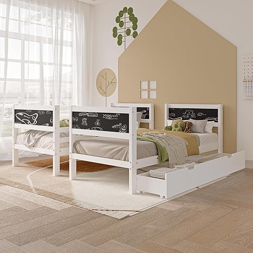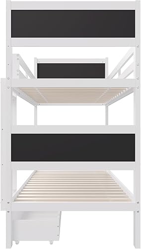 Lit superposé pour enfants, 90 x 200 cm, lits enfants avec tableau et tiroir de rangement, lit divisé en 2 lits simples, avec échelle à trois niveaux et protection anti-chute, pin, blanc (Blanc-01)