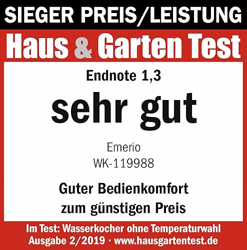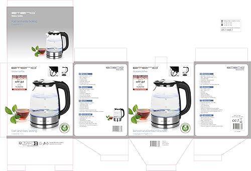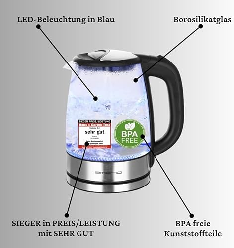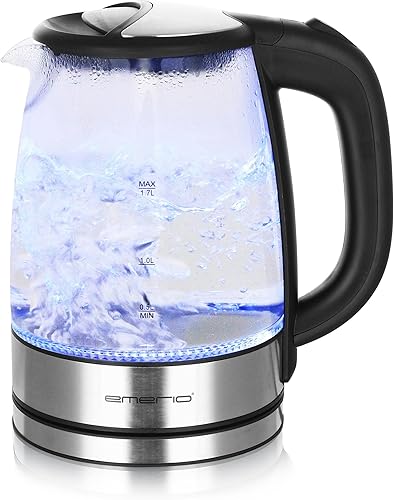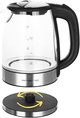 Emerio Bouilloire en verre WK-119988, 1,7 litre, 2200 watts, éclairage intérieur LED, base à 360°, gagnant du test prix/performance pour la maison et le jardin 02/2019, 1,7 litre, noir, argent