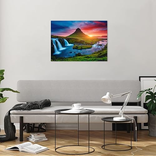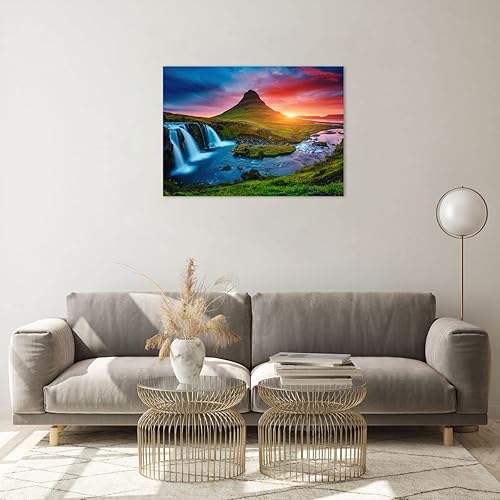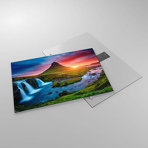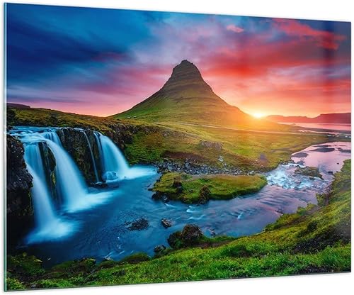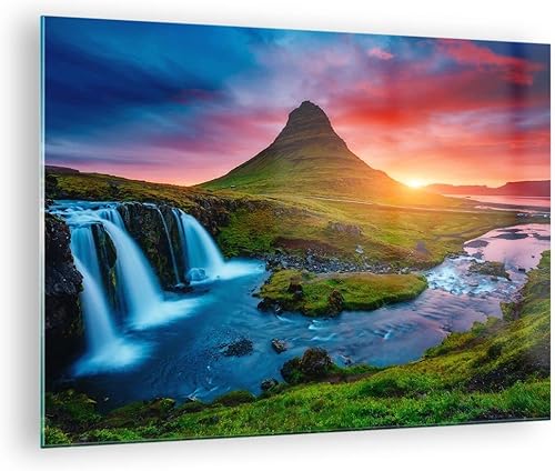 Moderne Impression sur Verre Coucher de soleil Cascade Islande volcan Image Tableau en Verre Decoration Murale 70x50cm Deco Salon Chambre Horizontal Petit Tableaux Decoratifs Muraux Art GAA70x50-2963