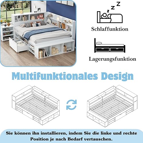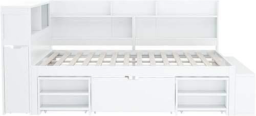 KOMHTOM Lit d'enfant Multifonctionnel avec Tiroirs, Bibliothèque et Armoire de Rangement, Cadre de Lit Plateforme, Sommier à Lattes en Bois, Blanc(sans Matelas) (90x200 cm)