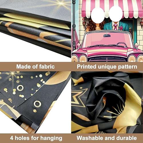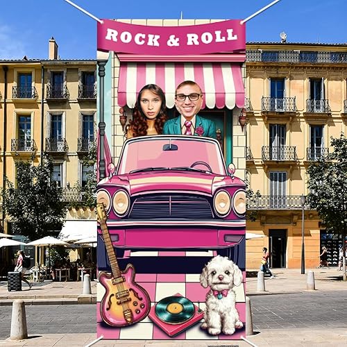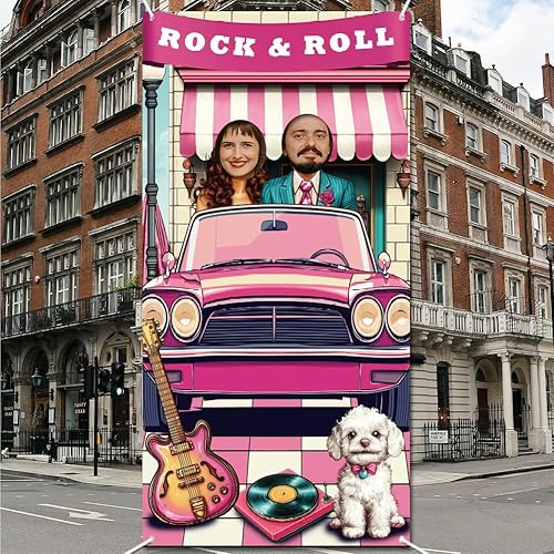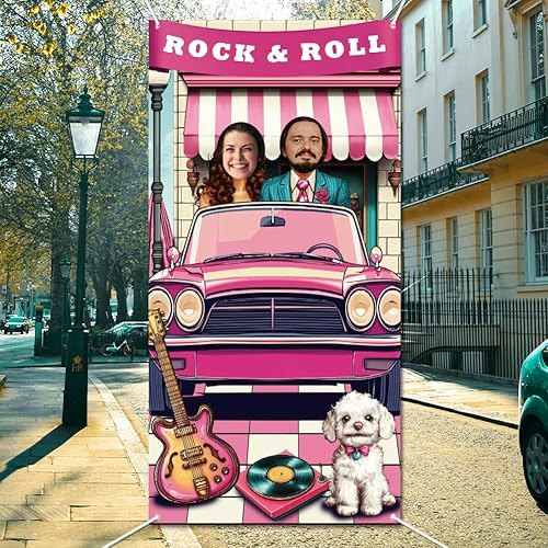 WADORN 50s Décorations de Fête Bannière de Porte, 50'S Thème Fête Rock and Roll Fond Photographie Toile de Fond 50s Rétro Voitures Visage dans Trou Accessoires pour 1950'S Fête 90x180cm