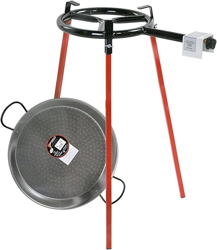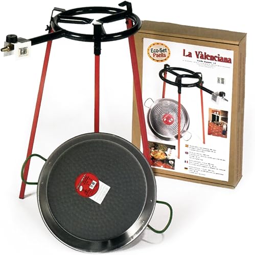 Eco Set Poêle à Paella 38 cm : Lot de 3 Pieds carrés + poêle à Paella en Acier Poli de 38 cm + brûleur à gaz de 300 mm