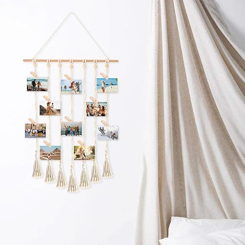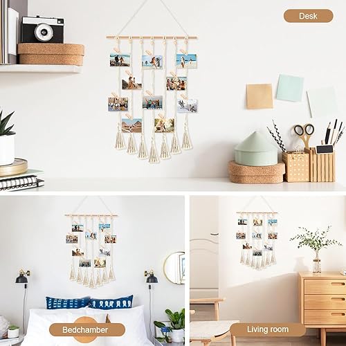 GIDWRIY Cadre Pele Mele Photo Mural,Accroche Photo en Macramé,Porte Photo Bohème,Tableau Photo avec 30 Clips en Bois,Support Photo Suspendu pour Photo Polaroid,Cadre Photo Suspendu Corde
