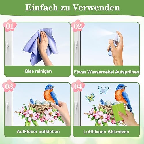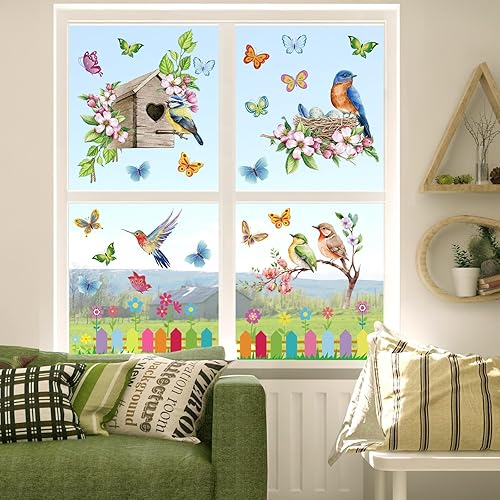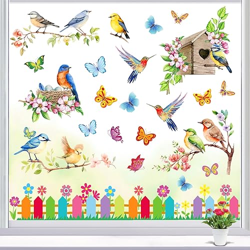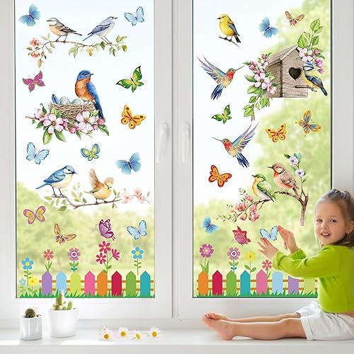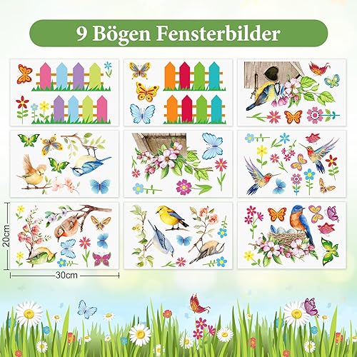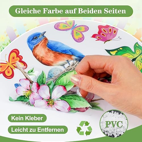 Raoclay Stickers Fenetre Printemps, 9PCS Autocollant Fenetre Stickers Papillon Oiseaux Fleurs, Sticker pour Vitre Electrostatiques Decoration Printemps Réutilisable pour Chambre d'enfants Ecole