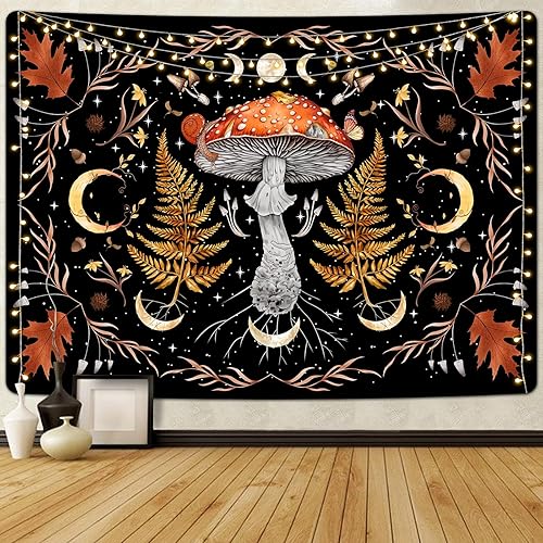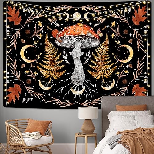 Alishomtll Tapisserie murale champignon vintage, lune feuille d'érable botanique noir et doré, tenture murale, esthétique florale naturelle, décoration murale, multicolore, chambre à coucher, dortoir,