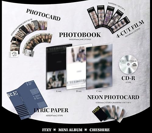 ITZY - Cheshire [B Version] Standard Album with PreOrder Benefit CD+Photobook+Photocard+Photo Cube+Clear Photocard+Poster+Lyric Paper+Neon Photocard+4-Cut Film+(Extra ITZY 6 Photocards+Pocket Mirror)