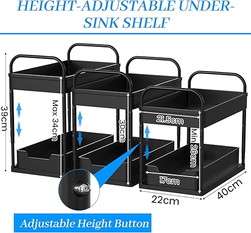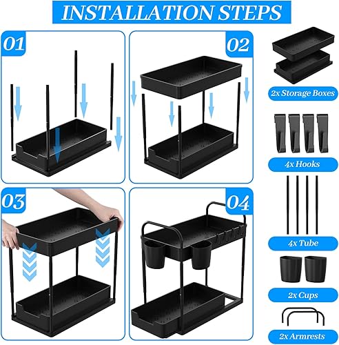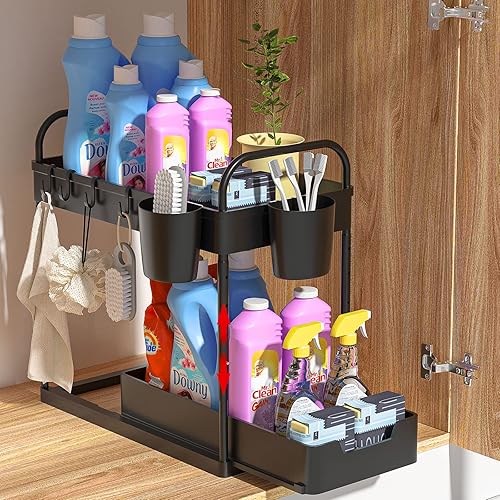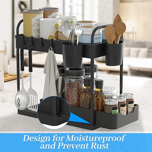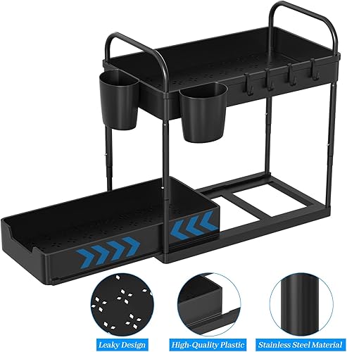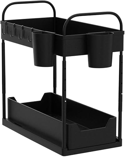 DUNSOO 2 Niveaux Rangement sous Evier Cuisine, Organisateur sous Evier avec 4 Crochets et 2 Gobelet Suspendu, Hauteur Réglable Etagere sous Evier pour Cuisine Salle de Bain, Noir