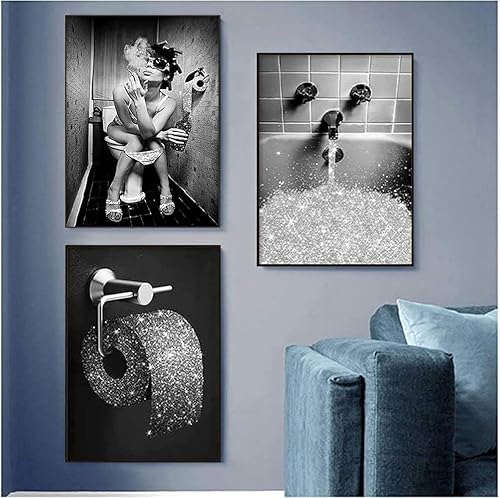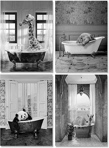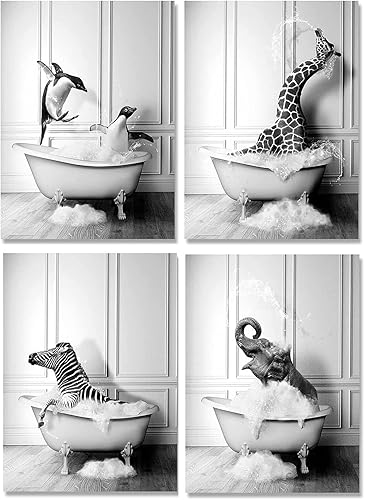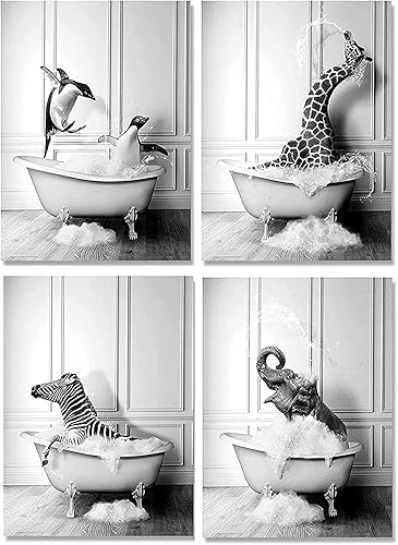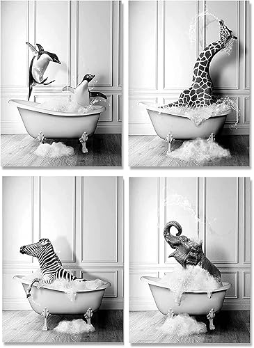 GHJKL Ensemble d'images en noir et blanc, tableaux de salle de bain, images d'animaux dans la baignoire, tableaux vintage sur toile, posters pour toilettes, salle de bain, décoration d'intérieur