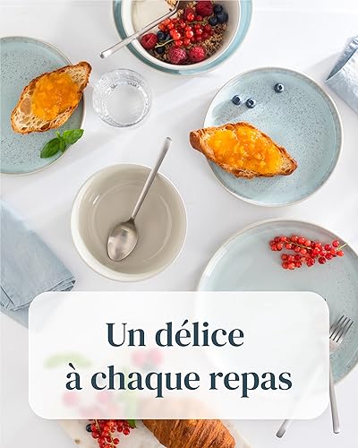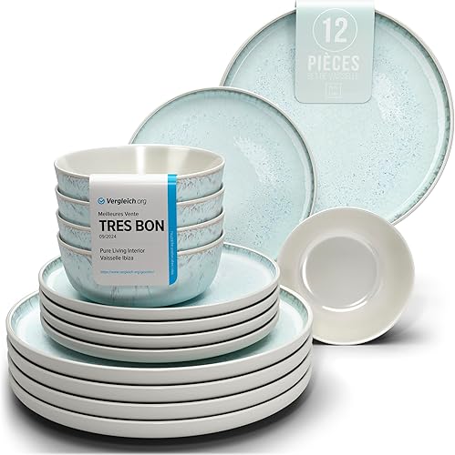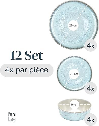 Service de Vaisselle en Grès Ibiza 12 pièces, Service de Table pour 4 Personnes, Adapté au Lave-Vaisselle et au Micro-Ondes, Assiettes Service de Table, Vaisselle Pure Living en Beige Bleu
