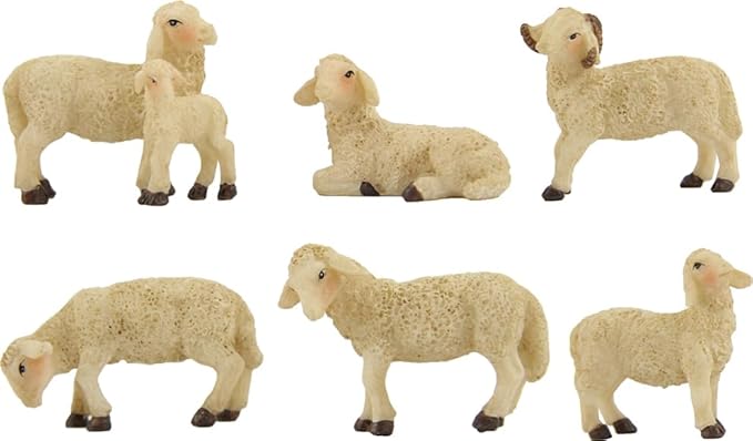 FADEDA 6 moutons avec bélier et agneau, hauteur : 5 cm, peints à la main, figurines de crèche détaillées, accessoires de décoration de table de Noël