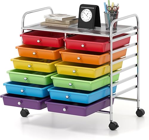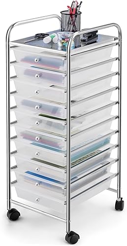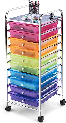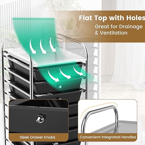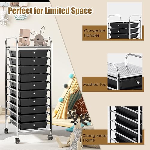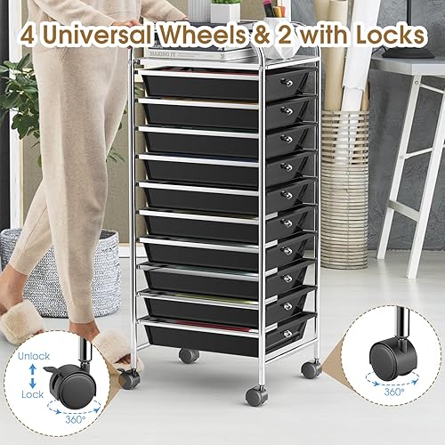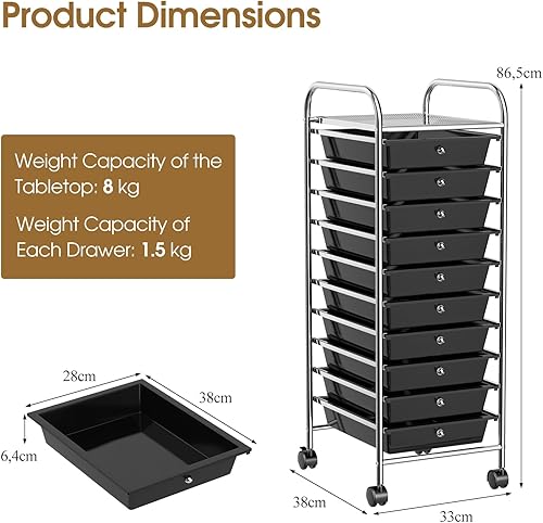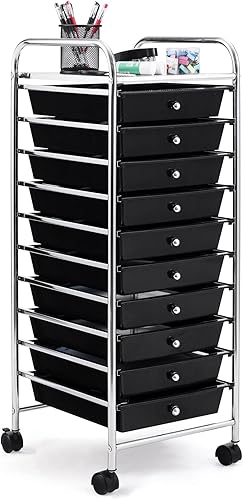 HOMASIS Chariot de Rangement avec 10 tiroirs, Chariot de Service avec Structure métallique et PP, Chariot latéral avec Roues verrouillables pour Salon, Chambre, Bureau, 38x33x86,5cm (Noir)