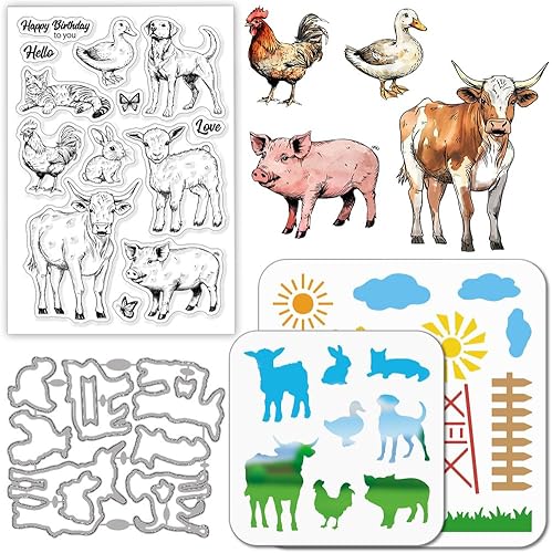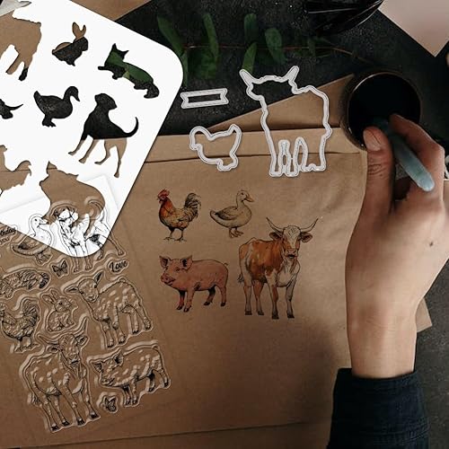 GLOBLELAND Tampons Transparents pour Animaux de la Ferme Matrices de Découpe Pochoirs de Peinture PET pour Fabrication Cartes Chat Chien Mouton Cochon Tampon en Silicone Salutations en Métal Matrices