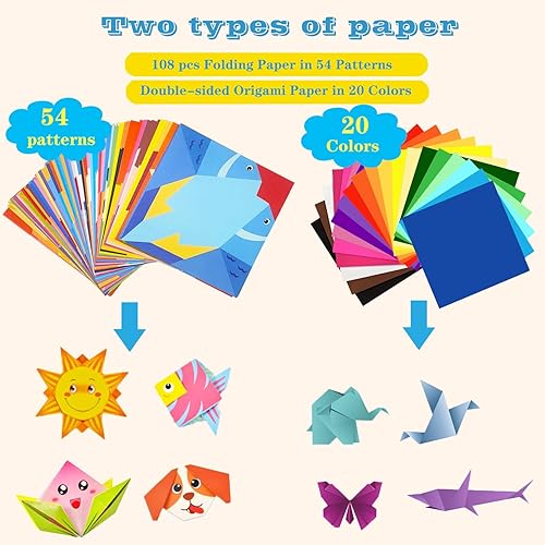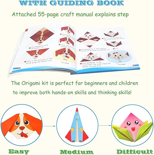Set de Papier Origami pour Enfants - 208 Feuilles Avec 54 Motifs, 15x15cm - Livre d'Instructions Inclus - Cadeau pour Les 3-12 Ans, Débutants, Garçons et Filles