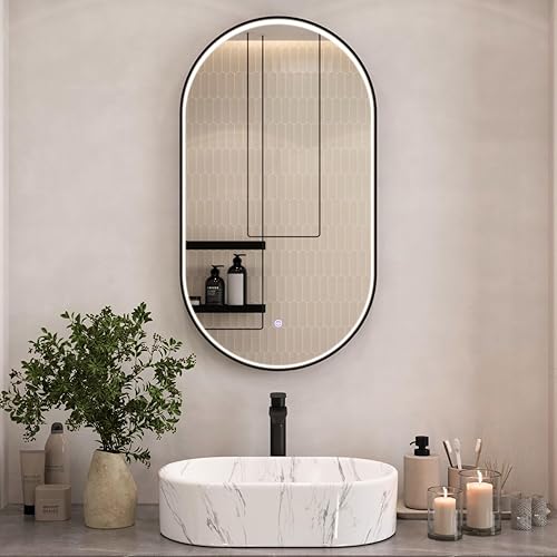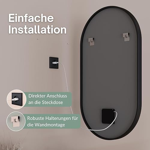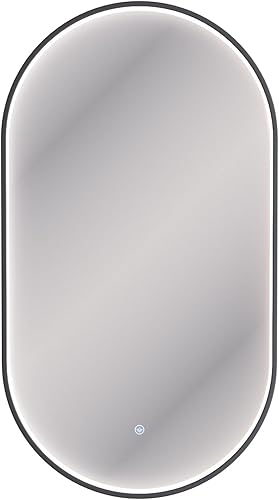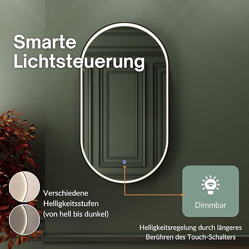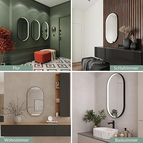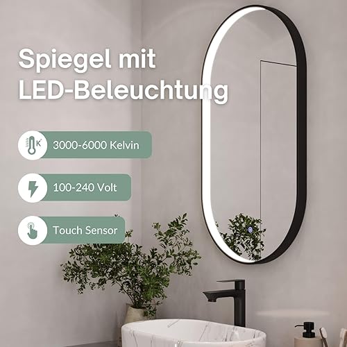 Planetmöbel GLORA Miroir de salle de bain avec éclairage 50 x 90 cm - Miroir avec cadre - 3 niveaux de lumière (3 000 - 6 000 K) - Avec interrupteur tactile - Grand miroir mural décoratif - Pour salle
