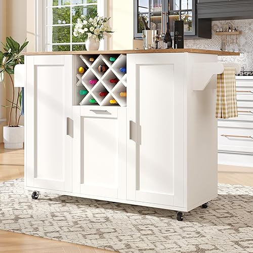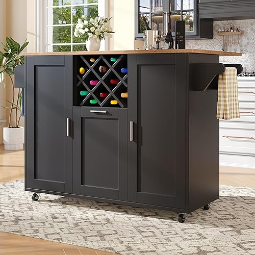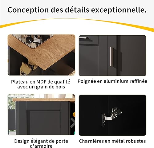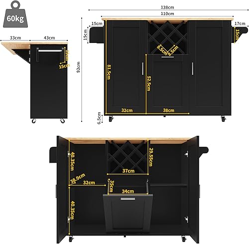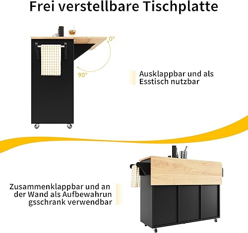 Zepneiy Îlot de Cuisine (135 × 46 × 86,6 cm) avec cloisons Amovibles, roulettes Amovibles, desserte avec établi, Plateau en similibois, avec Porte Serviettes latéral, Noir