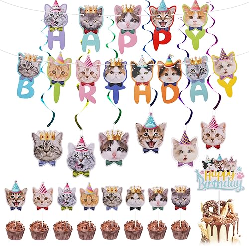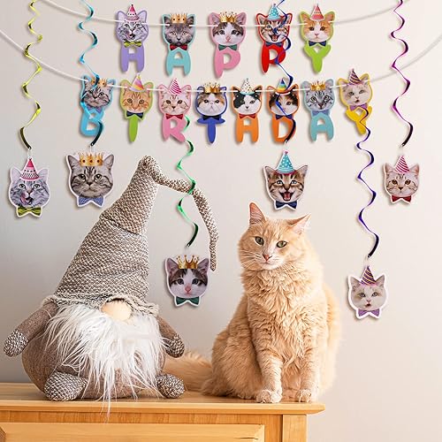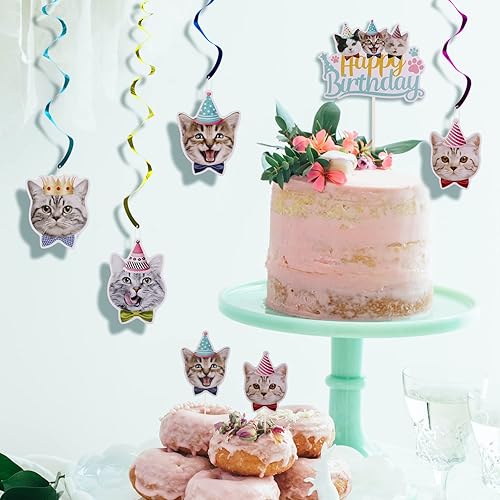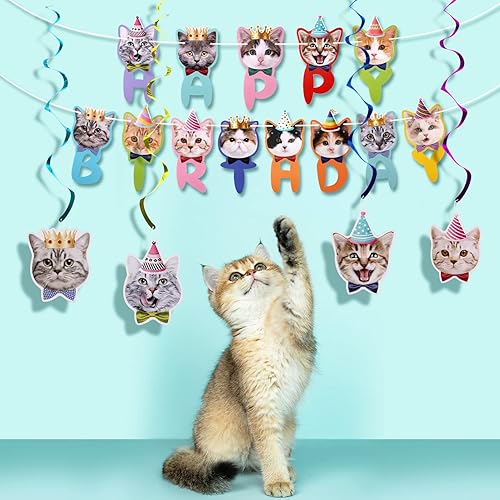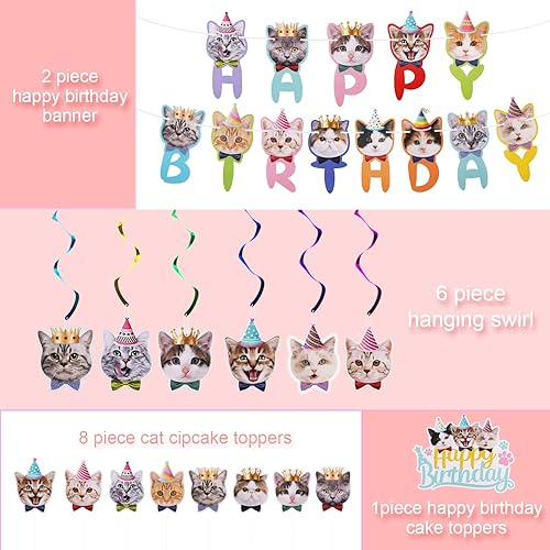 17pcs Deco Anniversaire Chat, Bannière de Fête et Décorations à Suspendre - Theme Chat Cake Topper pour Fête d'Anniversaire (Style Mignon)