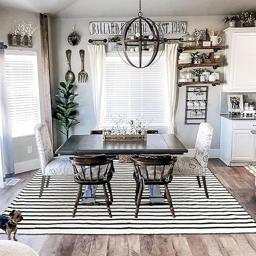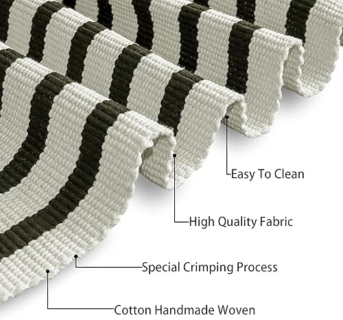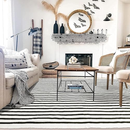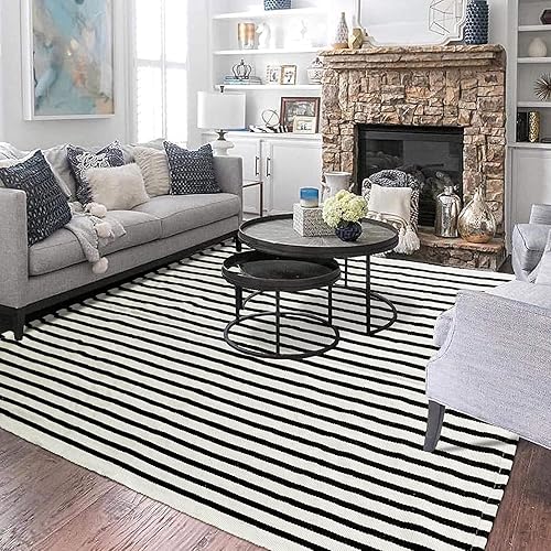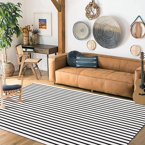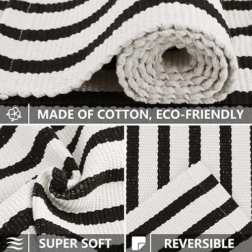 PANTSLINE Accueil Tapis lavable noir et blanc Tapis en coton rayé classique Boho pour véranda, paillasson, salon, chambre à coucher, entrée, cuisine, buanderie, 90 x 150 cm