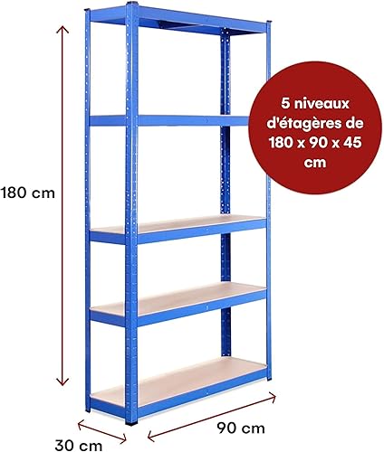 Rangement Garage: 180 cm x 90 cm x 30 cm | Bleu - 5 Niveaux | 175 kg par tablette (Capacité Totale de 875 kg) | Garantie de 5 ans