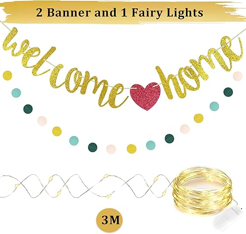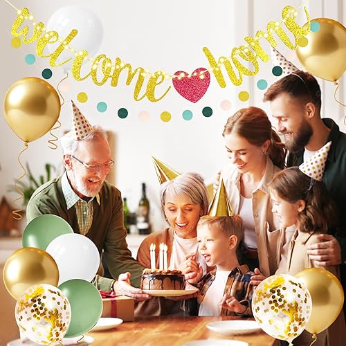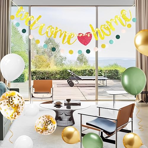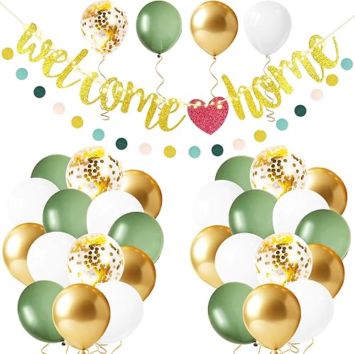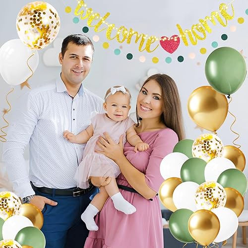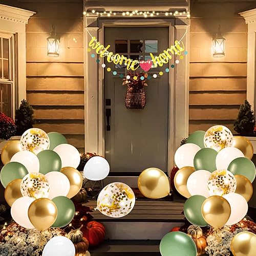 CoKeeSun Décoration de maison avec inscription « Welcome Home Baby » - Guirlande de ballons de bienvenue - Bannière de retour - Ballons verts et dorés - Pour pendaison de crémaillère, maison