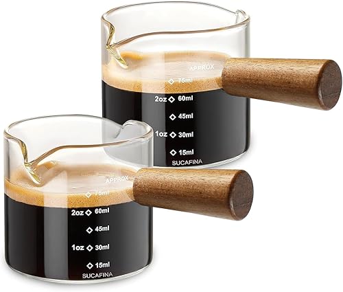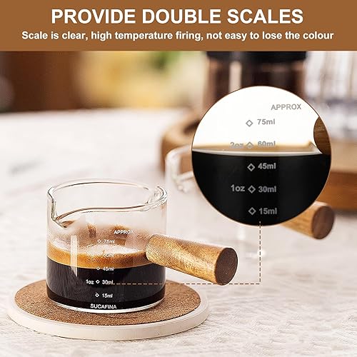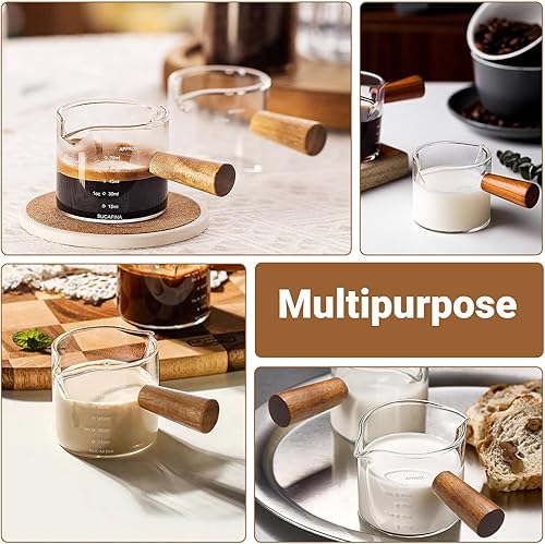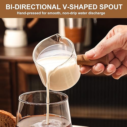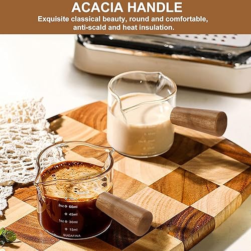 2 Tasses à Expresso avec Poignée en Bois - Tasses à Café avec Bec Verseur Double et Double Échelle, 100 ml, Matériau en Verre Borosilicaté Haute Teneur en Bore, Bec en V, Idéal pour Café, Lait et Plus