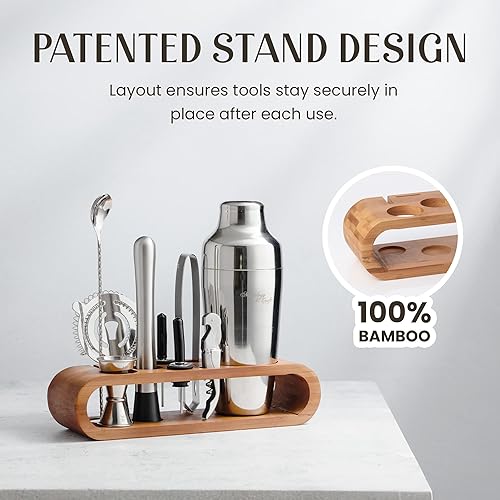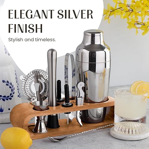 Kit de mixologie pour barman : lot de 10 outils de barman avec support en bambou élégant et shaker à martini - argenté