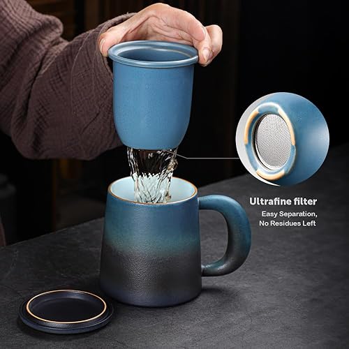 ecooe Tasse à thé avec infuseur à thé et couvercle, 420 ml(Pleine Capacité) Grandes tasses à thé en céramique avec passoire en acier inoxydable - Bleu Noir