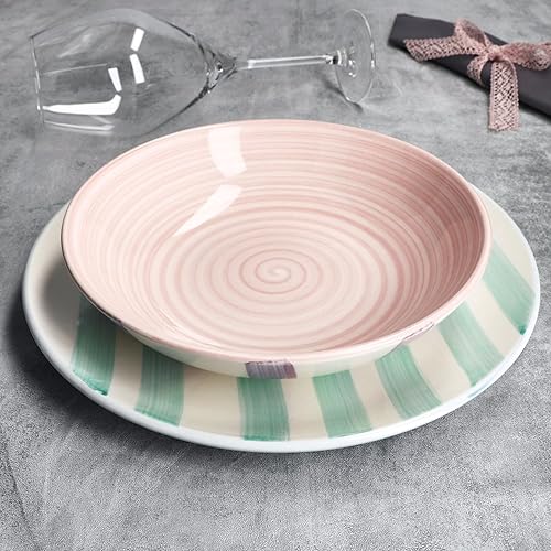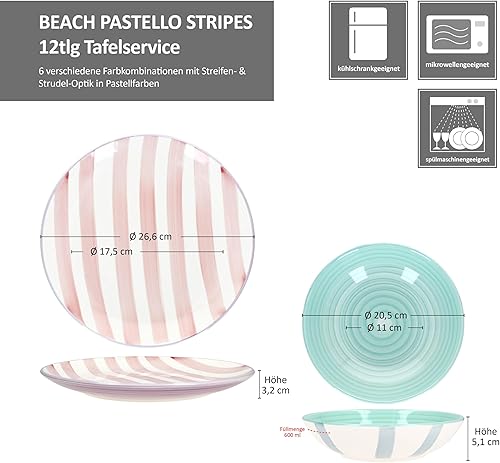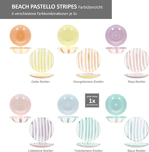 MamboCat Beach Pastello Stripes Service de table 12 pièces I Vaisselle en faïence avec rayures pastel pour 6 personnes I 6 assiettes plates et 6 assiettes creuses pour le petit déjeuner, le déjeuner