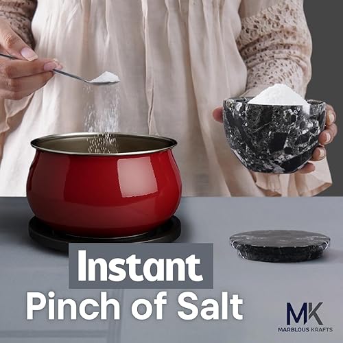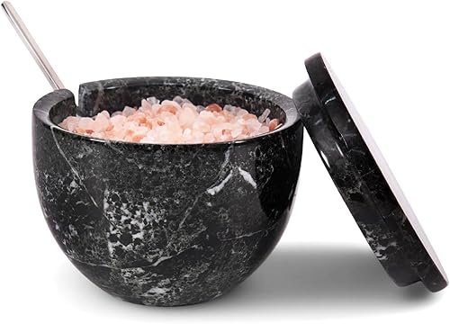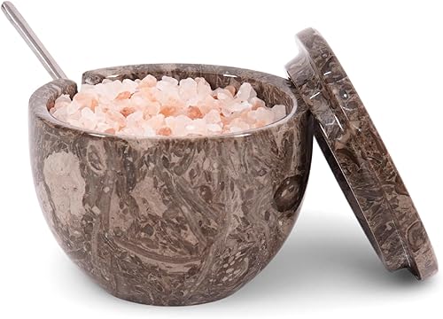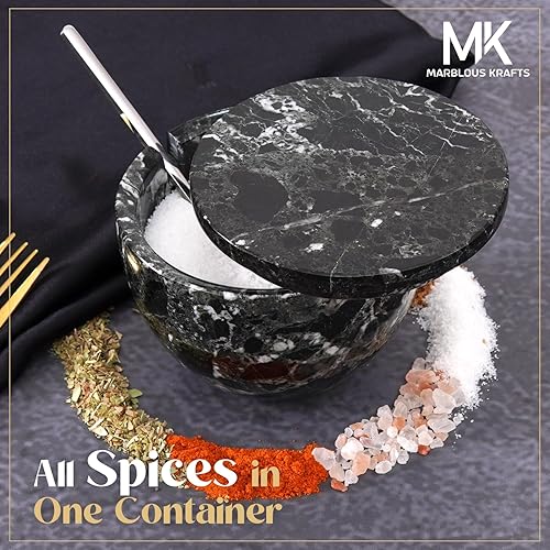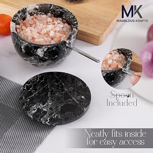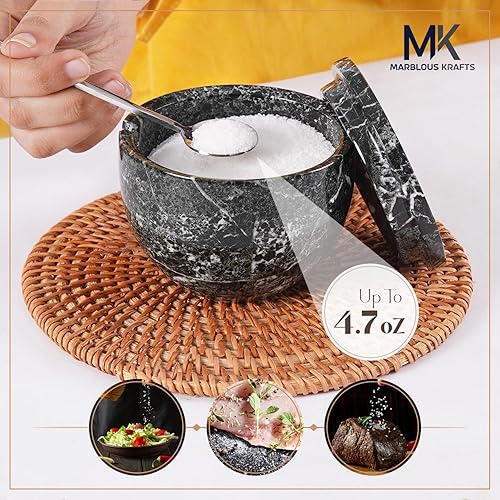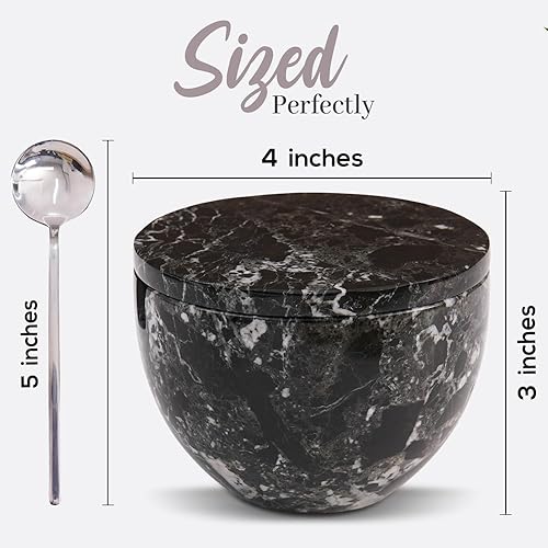 MARBLOUS KRAFTS Salière en marbre avec couvercle et cuillère - 10,2 x 7,6 cm - Blanc - Fait main - Pour café, sucre et sel - Pour comptoir, assaisonnement - Maison et cuisine