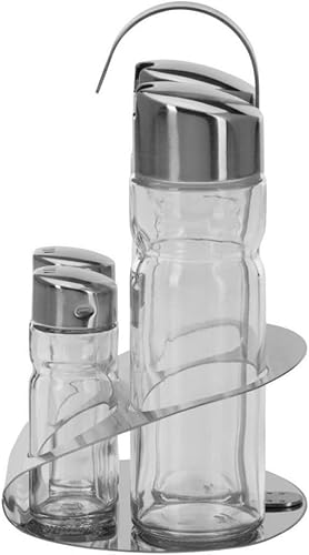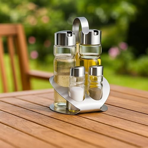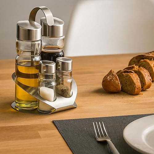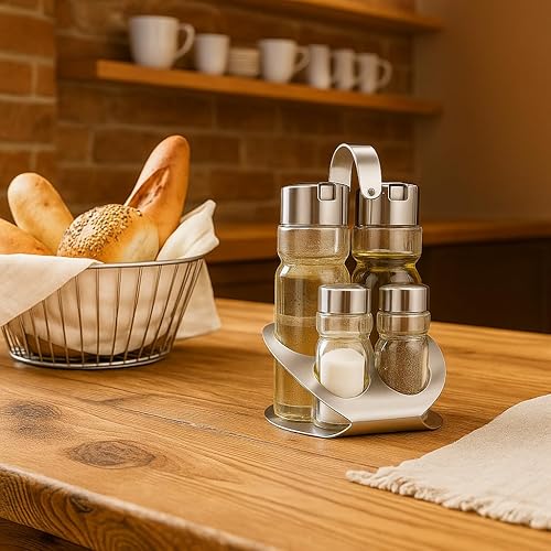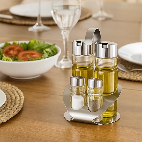 MGE - Set Huilier Vinaigrier avec Salière et Poivrière - 4 Pièces avec Support en Acier Inoxydable - Bouteilles en Verre Rechargeables Antigoutte - Élégant pour Cuisine et Table