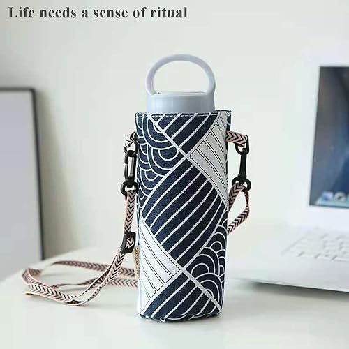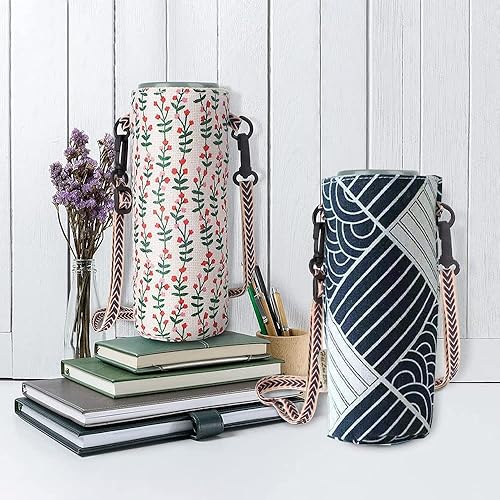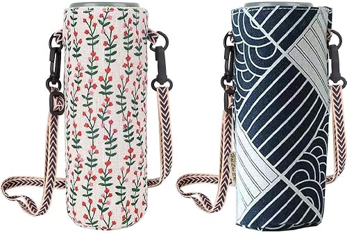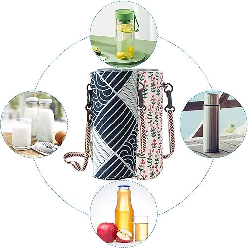 SSyang 2 pièces Porte-Bouteille Sac fourre-Tout,Porte-Bouteille d'eau Étui avec Bandoulière Réglable pour Bouteille en Acier Inoxydable et en Plastique,19 * 8cm(Bandes Bleues et Blanches+Floral)