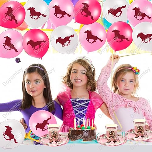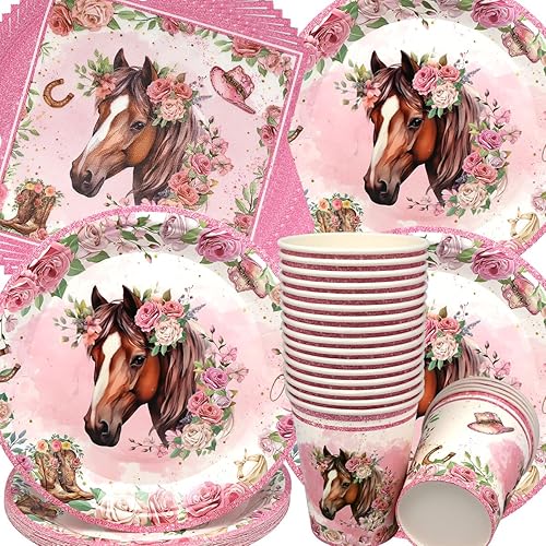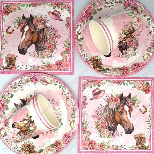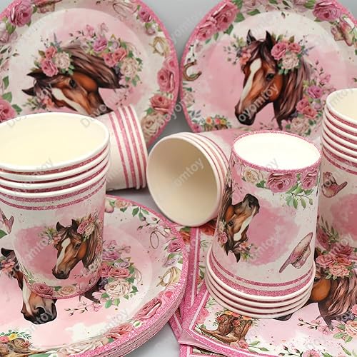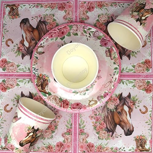 Vaisselle de Fête Chevaux Anniversaire,Doyomtoy Chevaux Vaisselle Papier Set Assiettes en Papier Serviettes Tasses pour Chevaux Western Cowgirl Décorations Fête d'Anniversaire 20 personnes