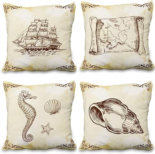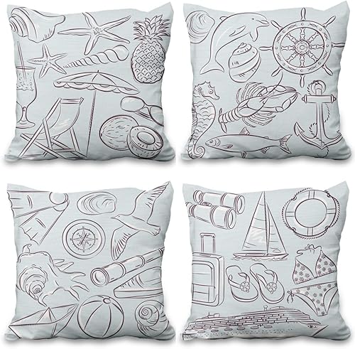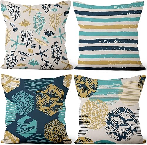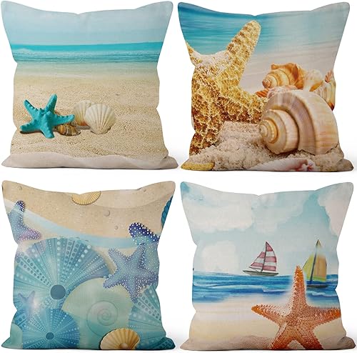 Aoihrraan 41x41cm Lot de 4 Plage Bord de Mer Housse de Coussin Mer Côtier Coquille Étoile De Mer Conque Lin De Coussincarré Taie d'oreiller Été Decoration pour Salon Litroom Canapé Jardin Chaise