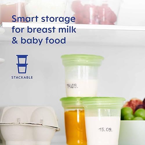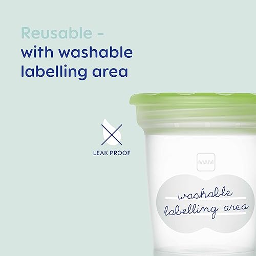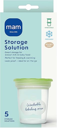 MAM Lot de 5 récipients de conservation, réutilisables et compatibles avec tire-lait, avec bande de mesure, système anti-déversement, compatible avec les micro-ondes, congélateur, chauffe-biberons
