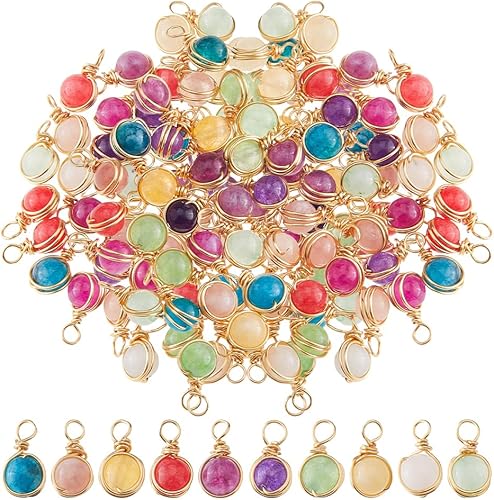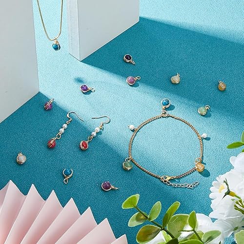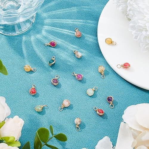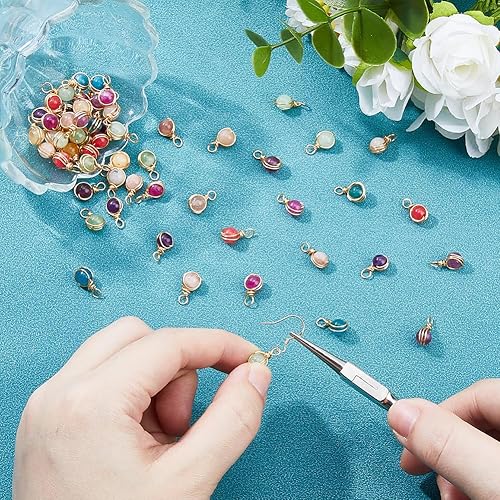 SUPERFINDINGS 60Pcs 10Couleurs Pendentifs en Pierre Naturelle Breloques Ronds Charms en Cristal de Quartz Charms en Pierres précieuses Pendentifs en Fil de cuivre doré pour Bracelets