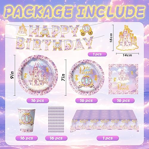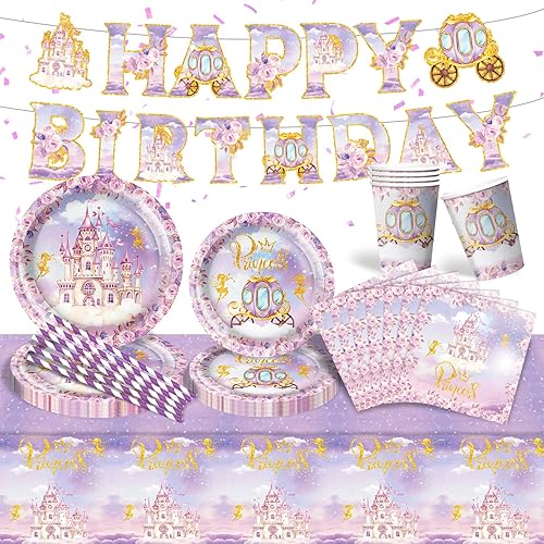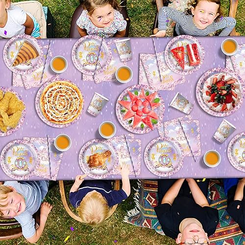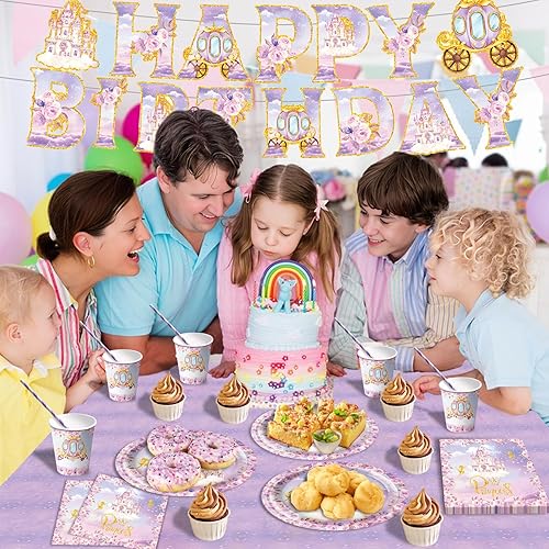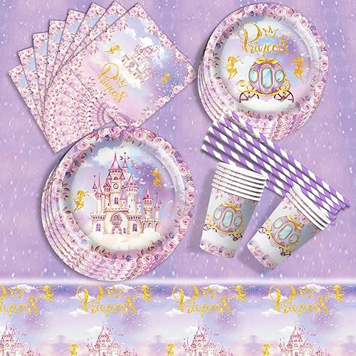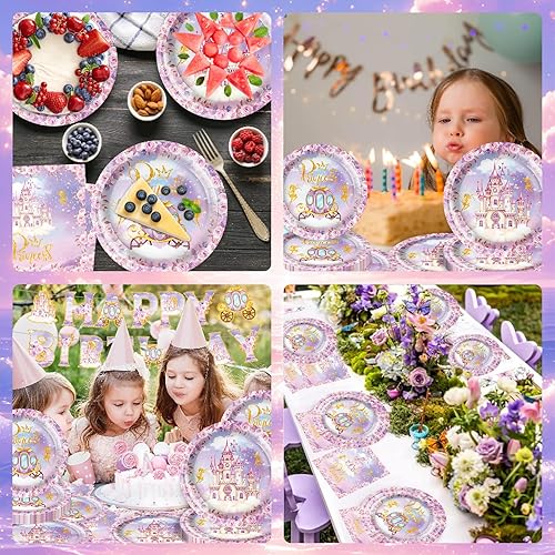 Ensemble de vaisselle de fête d'anniversaire princesse pour fille - Assiettes et serviettes de table - Violet - Motif château - Princesse féérique - Château - Décoration de fête