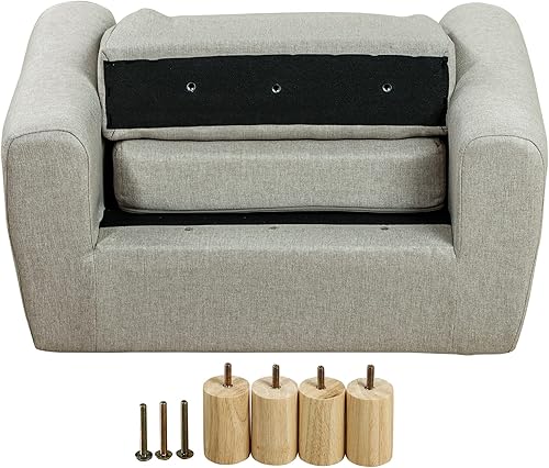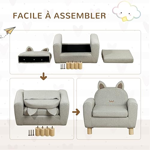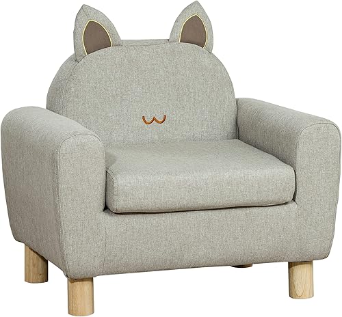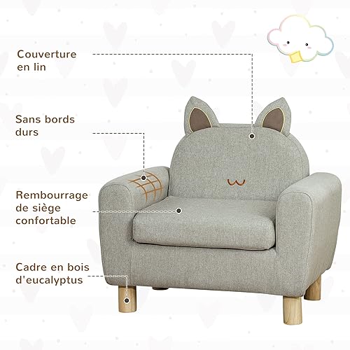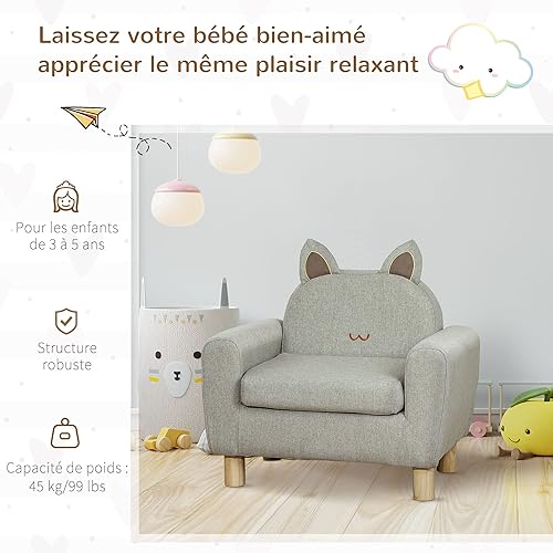 HOMCOM Fauteuil pour Enfant canapé Chaise Enfant Design scandinave Grand Confort avec Oreille de Chat piètement Bois et Tissu dim. 61l x 42P x 53H cm Gris