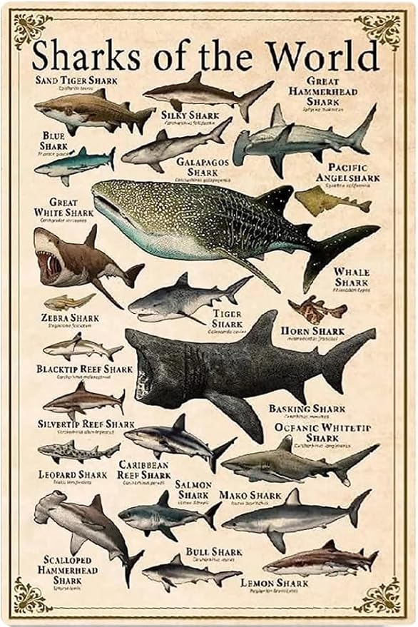 Geroclonup Plaque en métal « Sharks of the World » - Décoration murale - 30 x 40 cm
