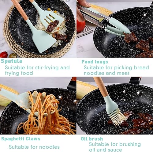 YUEHAO Ustensiles de Cuisine Silicone Bois 33 pièces,Antiadhésive Anti-Rayures et Résistante à Chaleur de Accessoire Cuisine Set,Ustensiles Cuisine sans BPA Set avec Pot de Rangement et S Crochets