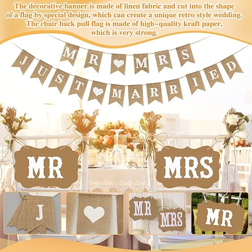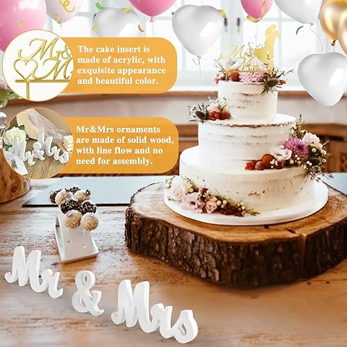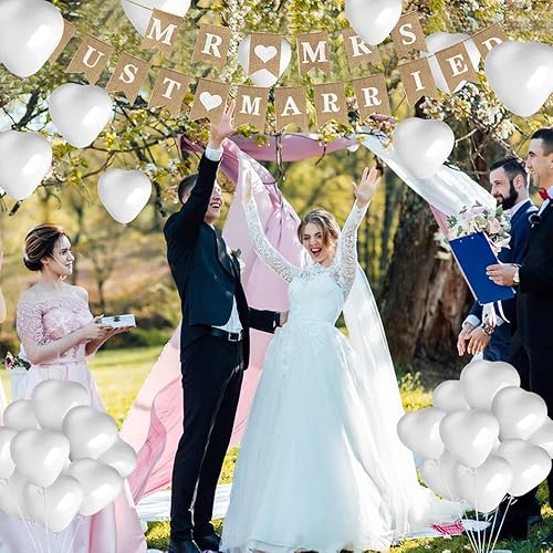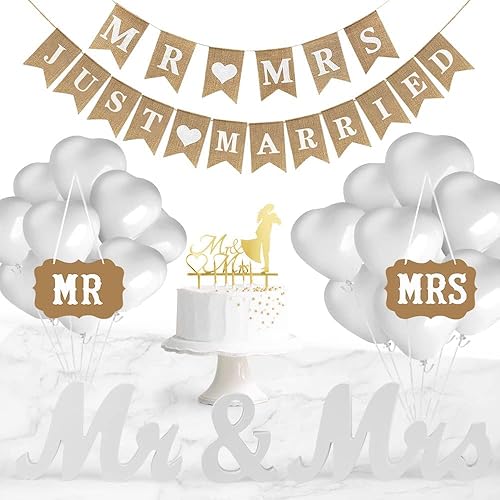 QINERSAW Set Décoration Mariage - Bannière Just Married, Lettres Mr & Mrs, Ballon Blanc, Cake Topper - Décorations de Table et Fête