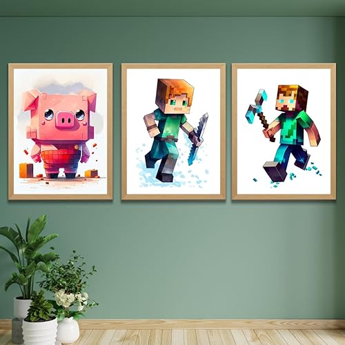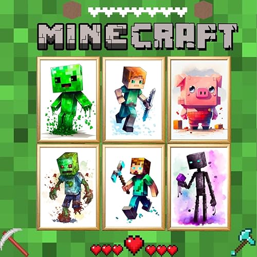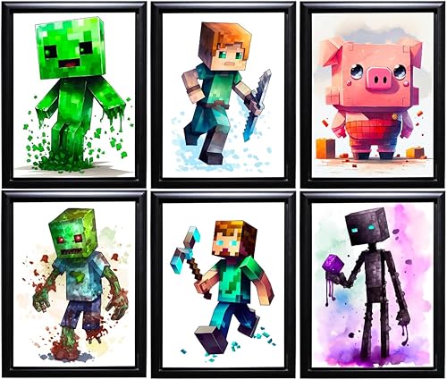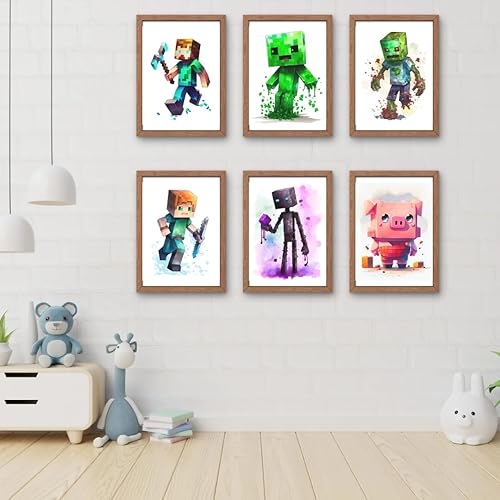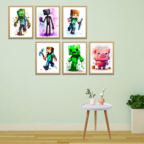TFH Art Design - Poster mural Minecraft – Décoration murale sur le thème des joueurs de mineurs – Art mural aquarelle – (décoration de salle de jeux vidéo) – Lot de 6 pièces – 20,3 x 25,4 cm – Sans