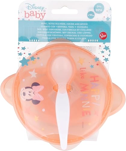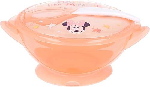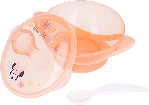 STOR Bol antidérapant avec Couvercle et cuillère Minnie pour Enfants en Plastique de qualité Alimentaire, résistant au Micro-Ondes et réutilisable.