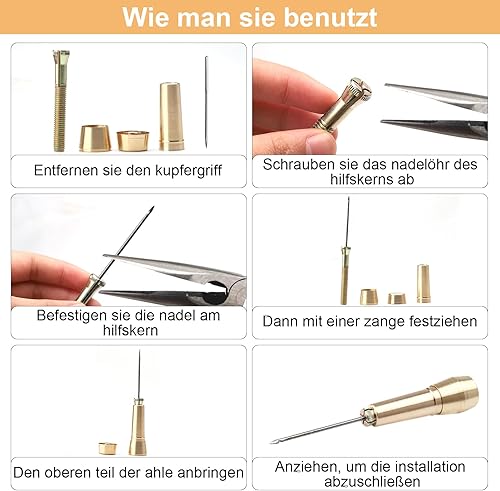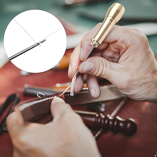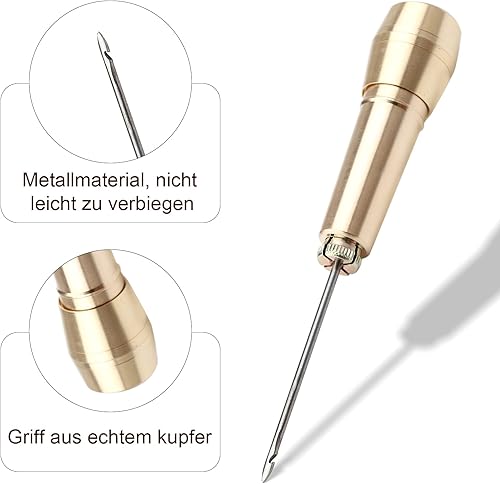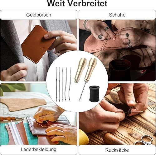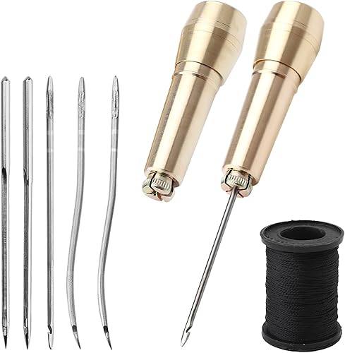 UOCAI Lot de 2 Alênes à Coudre pour Cuir Alène de Cordonnier en Cuir Couture Cuir avec 2 Poignées en Laiton, 2 Aiguilles Droites, 2 Aiguilles Courbes, 2 Trous D'Aiguille et 50 Mètres de Fil Noir