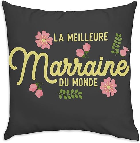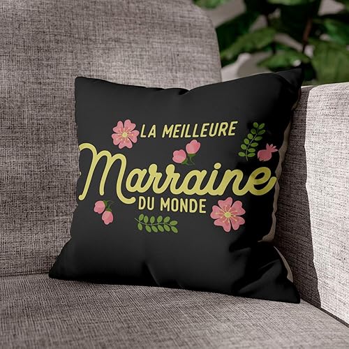 Coussin en Velours Noir - La Meilleure Marraine du Monde Famille Filleule - 40 x 40 cm - Toucher Velours - Housse et Coussin Inclus
