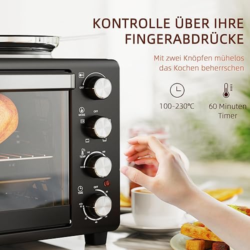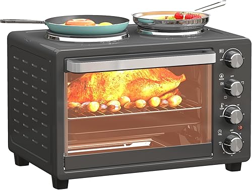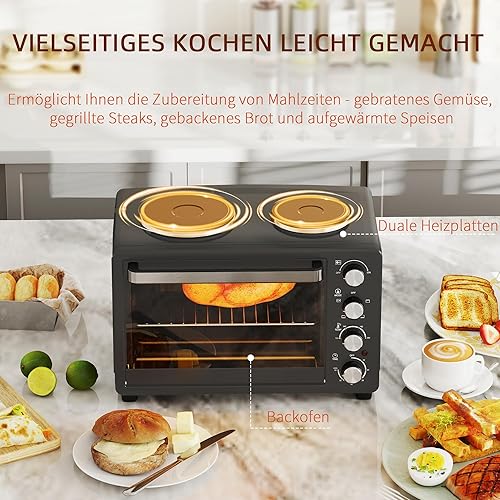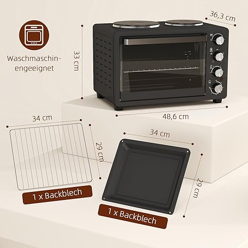 HOMCOM Mini-four 28 L 2600W Mini-four 100-230℃ 60 min minuterie, avec 2 plaques chauffantes, plaque de cuisson et grille Four à pizza avec plateau ramasse-miettes, poignée plateau Noir
