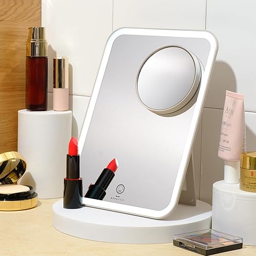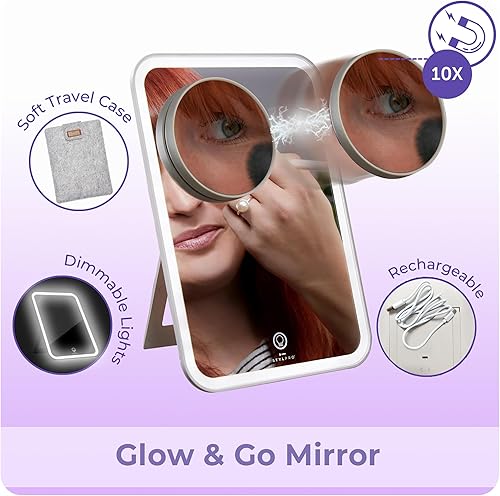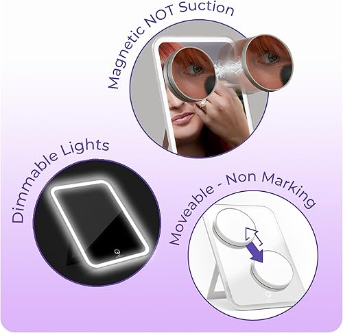 STYLPRO Miroir de courtoisie avec Miroir magnétique grossissant x 10 | Rechargeable | Lumières LED à intensité Variable avec Bouton pour écran Tactile | Support réglable | Étui de Voyage de Luxe Doux