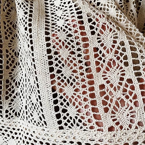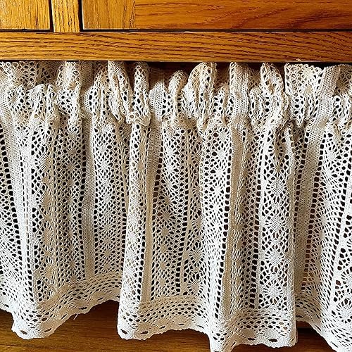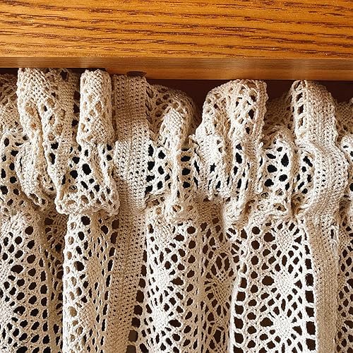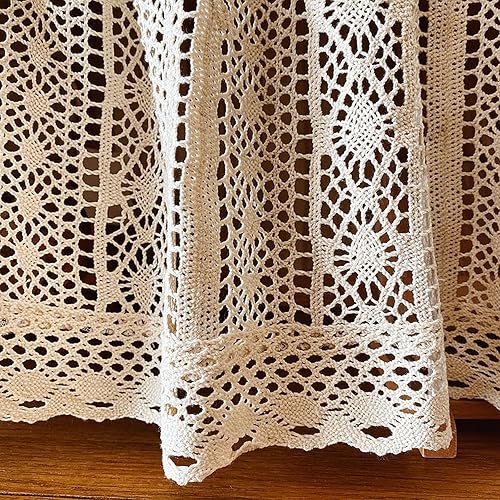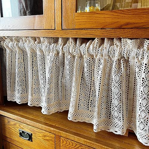 A.Monamour Rideau de Cuisine Court pour Petit Fenêtre Boho Beige Coton Crochet Géométrique Creux Dentelle Tricotée Demi Rideau Brise-bise Rideaux à Disques Rideaux à étages Passe-Tringle Bistro Café