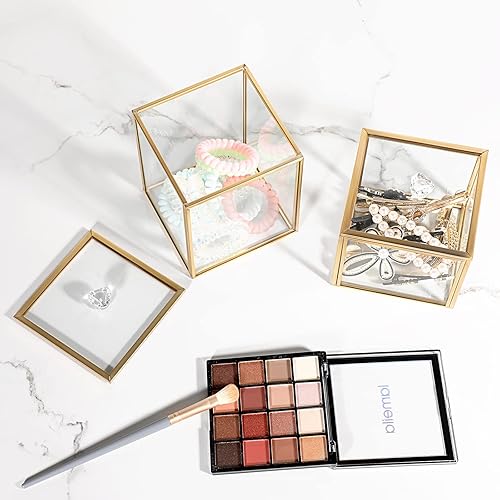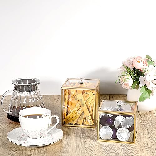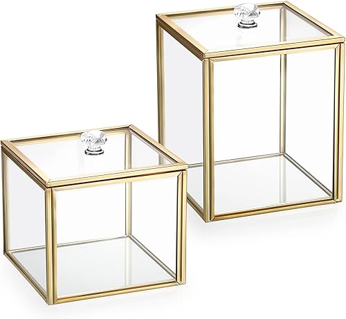 SUMTree Qtip Lot de 2 distributeurs de boules de coton en verre doré avec couvercle, pour coton-tige de salle de bain avec poignée en cristal, bocal de rangement en verre pour coiffeuse de cuisine et