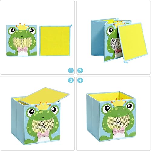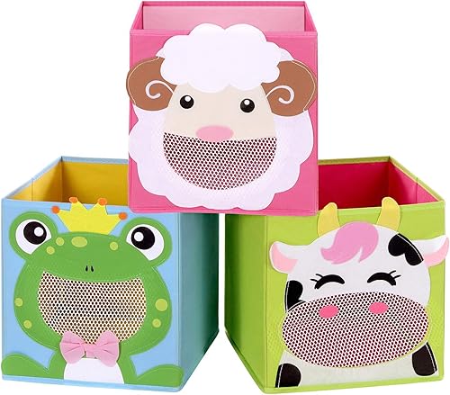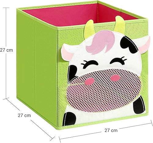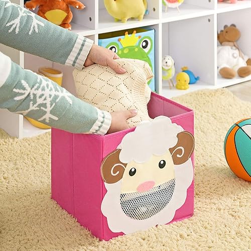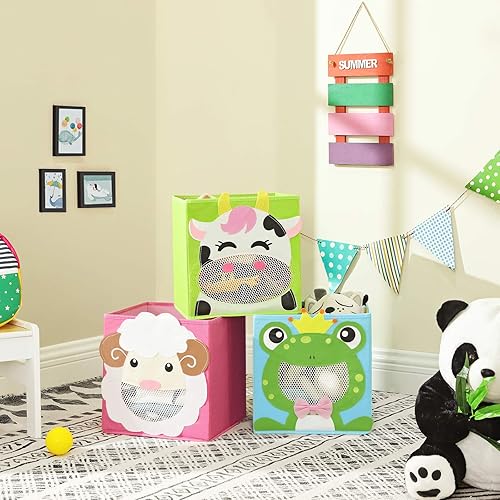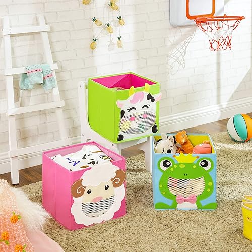 SONGMICS Boîtes de rangement, lot de 3, Organisateurs de jouets, Coffre, Panier, pliables, pour chambre d'enfant, salle de jeux, 27 x 27 x 27 cm, thème animaux, Bleu, vert et rose RFB01PG